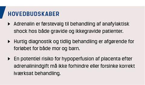 fosteret [11]. I et fårestudie fandt man, at det uterine blodflow blev reduceret med 55-65% over tre minutter efter intravenøs indgift af 10-20 mikrogram adrenalin. Der var ingen ændring i føtalt pH-niveau og hjertefrekvens eller tegn på føtal kompromittering [12]. På baggrund heraf er der rejst tvivl om, hvorvidt adrenalin bør være førstevalg hos gravide [3, 13]. Desuden kan høje doser adrenalin forårsage kardiale arytmier, myokardieinfarkt og intracerebral blødning.