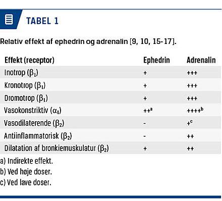 ephedrin dog en øget α-adrenerg effekt og kan derved også forårsage den uønskede vasokonstriktion i uterus [13-15]. Ephedrin vurderes at være en mindre potent vasopressor og bronkodilator end adrenalin i tilfælde af anafylaktisk shock [3] og har ingen specifik effekt på immunsystemet (Tabel 1).