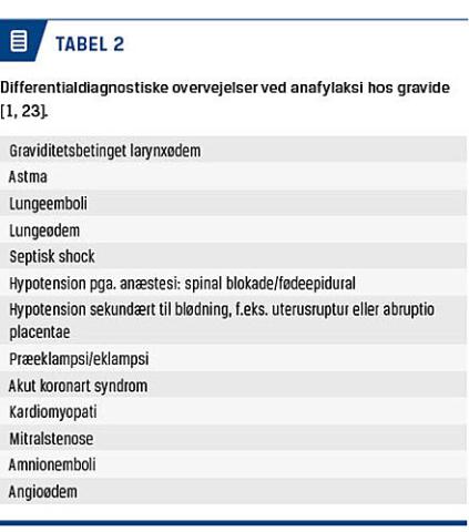 Indtil terminen vil symptomerne på anafylaksi hos gravide være som hos ikkegravide. Symptomerne kan dog også være intens kløe i vulva/vaginalområdet, lændesmerter, uterine kontraktioner, føtalt stress og præterm fødsel. Det er vigtigt at være opmærksom på, at symptomer, der involverer uterus og foster, kan være tegn på anafylaksi, men oftest vil symptomer fra andre organsystemer også være til stede [1, 3]. Ved terminen må differentialdiagnostiske overvejelser omfatte andre årsager til respiratorisk stress og kardiovaskulær kompromittering (Tabel 2) [1].