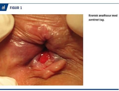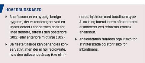 En analfissur er en længdegående defekt i anodermen analt for linea dentata. Epidemiologien bag sygdommen er dårligt afdækket, men der er formentlig tale om en hyppig tilstand, der afficerer begge køn lige meget [1]. Den sande incidens er vanskelig at vurdere, da mange patienter ikke opsøger læge, og da sygdommen i flere tilfælde er selvlimiterende uden behandling. Analfissurer inddeles i: 1) akutte fissurer, som heler inden for seks uger på konservativ terapi, og 2) kroniske tilfælde, som er symptomgivende i mere end seks uger. Den typiske analfissur er lokaliseret i den posteriore (90%) eller den anteriore midtlinje. Atypiske, sekundære analfissurer kan ses i hele analkanalens cirkumferens og associeres med sygdomme som mb. Crohn, hiv, cancer, syfilis, tuberkulose, herpes og eksem samt traumer. Atypiske analfissurer bør udredes i generel anæstesi med podning og biopsi og vil ikke blive omtalt her. Andre differentialdiagnoser er den intersfinkteriske abscess (med konstant smerte og forhøjede infektionstal) og de lave intersfinkteriske fistler, hvor den indre åbning kan forveksles med en kronisk fissur og den ydre åbning med en sentinel tag.