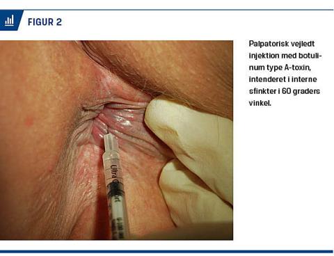 På Abdominalcenter K, Bispebjerg Hospital, praktiseres proceduren palpationsvejledt, ambulant og uden anæstesi. Der injiceres 25 IE botulinum type A-toxin i den interne sfinkter ved kl. 3 og kl. 9 i en 60 graders vinkel i forhold til horisontalplanet mod den ipsilaterale natis. Dette er i et griseforsøg fundet at være den optimale vinkel [9] (Figur 2).