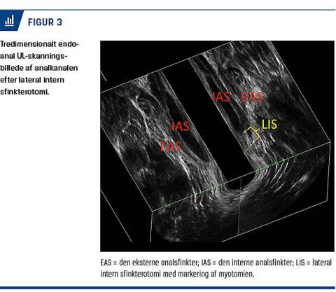 Den primære kirurgiske behandling af behandlingsrefraktær, kronisk analfissur er lateral intern sfinkterotomi (LIS). Denne procedure kan også vælges som førstevalgsbehandling hos unge, normalvægtige, mandlige patienter med langvarig eller udtalt symptomatologi. Ved LIS deles den anale del af den interne sfinkter, men der er stor variation i, hvordan proceduren udføres både globalt og regionalt. Traditionelt deles sfinkteren til linea dentata, men et randomiseret prospektivt studie har vist, at lavere sfinkterotomi giver mindre grad af temporær inkontinens end almindelig sfinkterotomi 2% vs. 11%, men også langsommere heling. Studiet viste, at i gruppen med sfinkterotomi op til linea dentata fik 4% persisterende inkontinens, alle var kvinder [15]. På Abdominalcenter K, Bispebjerg Hospital, praktiseres lukket LIS UL-vejledt. (Figur 3) Beavers kataraktkniv indføres i den intersfinkteriske grøft ved kl. 3, og den anale del af sfinkter deles op til