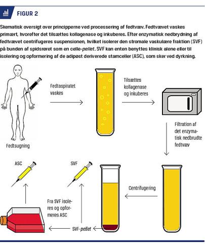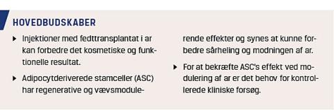 væske, indtil det er frit for blod. Herefter tilsættes kollagenase, og fedtet inkuberes mhp. enzymatisk nedbrydning af vævet. Efter inkubation filtreres og centrifugeres det enzymatisk nedbrudte væv, således at der fra bunden af spidsrørene kan aspireres en pellet, der består af en heterogen population af celler, kaldet den stromale vaskulære fraktion (SVF). Fra SVF kan man ved dyrkning isolere ASC og opformere disse. Man kan ved dyrkning af ASC opnå en mere homogen cellepopulation, hvor man samtidig kender celleantallet, i modsætning til SVF, som er kendetegnet ved en ukendt stamcellekoncentration, der kan variere bl.a. pga. alder. SVF og ASC bruges protokolleret til at berige fedttransplantatet for at forbedre overlevelsen og mindske resorptionen. Gentile et al har påvist, at fedtinjektioner beriget med SVF forbedrer arkvaliteten mere end injektioner af rent fedtvæv [23]. Forbedringen formodes at ske via forskellige mediatorer, der stimulerer sårheling og vævsregeneration [24] bl.a. ved at hæmme den øgede mængde af mastceller og den kroniske inflammation, som de forårsager ved frigivelse af cytokiner, vækstfaktorer samt histamin, der stimulerer fibroblaster til dannelse af bindevæv. Injektion af opformerede ASC i akutte brandsår har hos dyr vist øget heling og nedsat arvævsdannelse. Dette anføres at ske ved at ændre forløbet af remoduleringsfasen [25]. Et klinisk studie har vist forbedret sårheling i akutte og subakutte brandsår, som blev behandlet med fedttransplantation, men studiet var ikke kontrolleret [13].