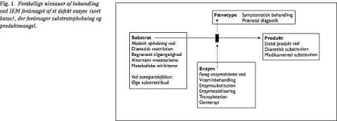 Somatisk genterapi. Genterapi har været effektiv ved få sygdomme, fx severe combined immunodeficiency og hæmofili B (26). Den forskningsmæssige interesse er stor, og genterapeutisk korrektion af flere IEM hos dyr er dokumenteret (27). Der er mange problemer, inkl. immunologiske reaktioner på vektor, for lille grad af geninkorporering, for lille stabilitet af det indsatte gen og manglende kontrol af placering i genomet og af genets ekspression (1). Genterapeutiske protokoller, inkl. fase 1-kliniske forsøg, er i gang og kan åbne nye terapeutiske muligheder for IEM.