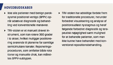 Formålet med artiklen er at bringe den nyeste status på BPPV-behandling i Danmark og at fremstille en detaljeret og stringent trin for trin-manual til de praktiske og tekniske aspekter, som er forbundet med at benytte TRV-stolen ved de mest hyppige varianter af BPPV.