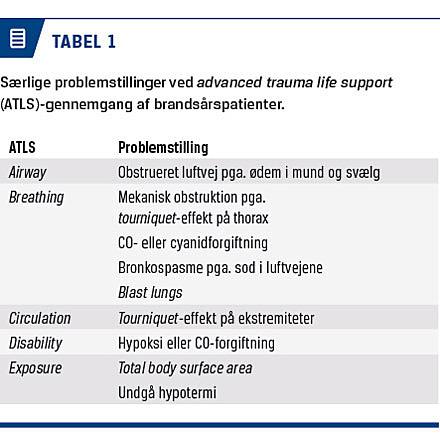 En forbrændt patient er primært en traumepatient og skal derfor vurderes ud fra skadesmekanismen og behandles ud fra airway, breathing and circulation-principperne. Herved undgår man, at ledsagende traumer eller komplikationer overses [1]. Så omend skaden kan se dramatisk ud, kan der skjule sig mere livstruende skader og tilstande, som kræver opmærksomhed først. De skader og komplikationer, som man skal være opmærksom på ved brandskader, ses i Tabel 1 [1, 2].