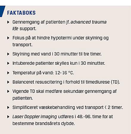 De kliniske retningslinjer for behandling af brandskader er for nylig blevet revideret mhp. tilpasning til internationale standarder, og samtidig har man simplificeret og præciseret den korrekte behandling af patienterne fra skadesstedet til ankomsten på brandsårsafdelingen. Der er lagt vægt på at mindske risikoen for hypotermi og dermed sænke mortaliteten for denne patientgruppe. Derfor bør skylning af brandskaderne hos intuberede patienter kun foregå i 30 minutter, hvor øvrige patienter med brandskader kan have gavn af op til tre timers skylning – hvis hypotermi samtidig kan undgås.