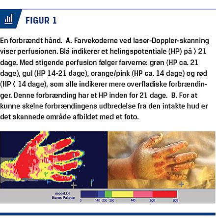 Ved LDI skannes huden ned gennem dermis, og skanneren registrerer de røde blodlegemers bevægelse som et udtryk for vævets perfusion [7]. Apparatet oversætter den målte perfusion til farvekoder, som indicerer vævets helingspotentiale (Figur 1). Blå farve viser den laveste perfusion, som både ses i intakt hud og ved dybe forbrændinger. LDI har vist sig at have en høj sensitivitet på 95-100% [8] i vurderingen af brandskaders dybde og kan udføres i tidsrummet 48-96 timer efter skaden.