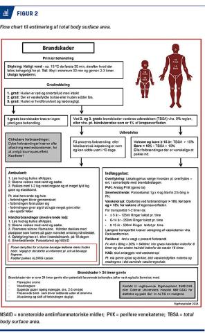 Traditionelt set anvendes niprocentreglen og Lund-Browders diagram [10] (Figur 2). Ved alle metoder er der høj interobservatørvariation [11]. Som en hjælp kan man anvende patientens håndfladestørrelse, som svarer til 1% af TBSA. Det anbefales, at der anvendes