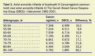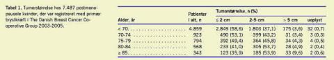 En gennemgang af histopatologiske parametre hos over 90.000 brystkræftpatienter i det amerikanske SEER-program viser, at de ældre diagnosticeres i et senere sygdomsstadie end de yngre, og at andelen af patienter med lokalt avanceret sygdom er større i denne aldersgruppe [4]. I en opgørelse fra The Danish Breast Cancer Cooperative Group (DBCG) 2001-2003 har man påvist tiltagende tumorstørrelse med stigende alder (Tabel 1 ). Omvendt stiger andelen af hormonfølsomme tumorer med alderen [5], hvilket indikerer, at sygdommen hos ældre generelt er mindre biologisk aggressiv.