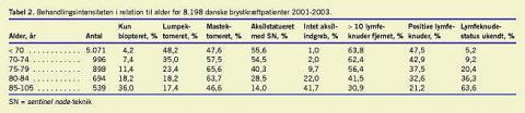 Der er ingen holdepunkter for, at det ubehandlede sygdomsforløb er anderledes hos ældre end hos yngre [4]. På trods af, at de ældre har mere fremskreden sygdom, modtager de mindre behandling [2, 3]. Ifølge data fra DBCG stiger andelen, der udelukkende får foretaget biopsi, ligesom andelen, som ikke bliver aksilstatueret, øges markant med stigende alder (Tabel 2 ).