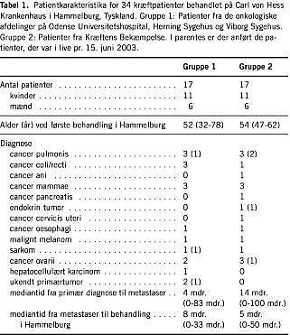 Det er alment accepteret, at kræftbehandlingen i Danmark i 1990'erne havde et efterslæb i forhold til de lande, vi normalt plejer at sammenligne os med. Påvisningen af, at overlevelsen for kræftpatienter i Danmark var dårligere end i de øvrige nordiske lande [1, 2], og det faktum, at flere og flere danske kræftpatienter søgte behandling i udlandet, var medvirkende årsager til, at Kræftplanen blev sat i værk, og at der blev afsat ekstra midler til behandling [3, 4]. Derved har de patienter, der for egen regning har fået behandling på CvHK, haft indirekte betydning for mange danske kræftpatienter. Spørgsmålet er, om de også selv har haft gavn af behandlingen.