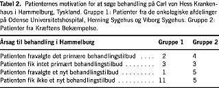 Behandling i udlandet er fortsat et kontroversielt emne, som til stadighed debatteres, ikke mindst i pressen. Da pressedækningen ofte er ensidig med fremhævelse af enkelte solstrålehistorier, har vi fundet det af interesse at efterundersøge en gruppe danske patienter, der har fået behandling på CvHK, for at kunne give en mere alsidig beskrivelse af effekt og komplikationer ved behandlingen.