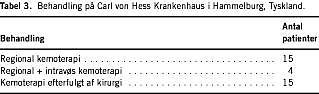 Resultater: Alle patienter fik regional kemoterapi, fire patienter fik tillige systemisk kemoterapi, og 15 patienter blev efterfølgende opereret. Hos 20 patienter kunne effekten vurderes, fire patienter opnåede delvis tumorsvind, mens svulsten voksede hos 11 patienter. Medianoverlevelsen var 9,7 mdr. Femten patienter oplevede svære bivirkninger, heraf var to fatale.