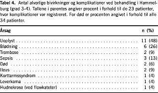 Komplikationer i forbindelse med behandlingen fremgår af Tabel 4. For 11 patienter kunne vi ikke få oplysninger om komplikationer efter behandlingen. To patienter (6%) døde på CvHK, og 15 patienter oplevede alvorlige (grad 3- eller grad 4-) komplikationer til behandlingen på CvHK.