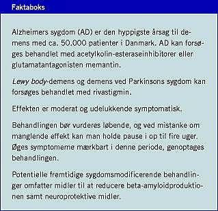 Både ved DLB og PDD ophobes Lewy-legemer i visse nerveceller. Lewy legemer består af abnorme aggregater af proteinet alfa-synuclein, som har betydning for neuronal kommunikation. DLB og PDD er karakteriseret af demens med fluktuerende funktionsniveau pga. vekslende bevidsthedspåvirkning, symptomer på Parkinsons sygdom og livlige synshallucinationer. Ved DLB optræder demenssymptomer samtidigt med symptomer på Parkinsons sygdom, mens PDD først optræder flere år efter debut af de motoriske symptomer. Ved begge sygdomme er der påvist en meget markant nedsat kolinerg aktivitet. Der er ingen studier af tilstrækkelig kvalitet, der kan dokumentere effekt af donepezil eller galantamin ved disse sygdomme, og effekten af memantin er ikke undersøgt [1]. Rivastigmin har i et studie vist effekt på BPSD og kognition ved DLB, og ved PDD har rivastigmin i tre studier vist effekt på alle fire parametre (global funktion, kognition, ADL-funktioner og BPSD). Effektstørrelser er på niveau med dem, som er påvist ved AD. Da det fortsat er uklart, om der er tale om en AchEI-klasseeffekt, bør rivastigmin forsøges som behandling mod disse sygdomme.