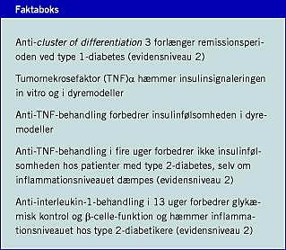 I to dobbeltblindede, randomiserede og placebokontrollerede studier [7, 8] og et randomiseret, åbent, men kontrolleret studie [9] påviste man ingen ændring i insulinresistensen af anti-TNFα-behandling i fire uger ved type 2-diabetes. I de to af studierne, hvor β-celle-funktionen blev undersøgt [7, 9] fandt man ligeledes ingen ændring. At behandlingen havde effekt på den inflammatoriske tilstand var dokumenteret i begge de studier, hvor inflammatoriske markører blev analyseret [8, 9], idet anti-TNFα-behandlingen medførte et fald i C-reaktivt protein (CRP) og IL-6. Anti-TNFα-terapien tåltes uden væsentlige bivirkninger.
