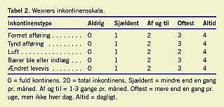Sværhedsgraden af inkontinenstilstanden blev klassificeret i henhold til Wexners inkontinensskala [10] (Tabel 2). Endvidere blev patienterne bedt om på en visuel-analog skala (VAS) fra 0 til 10 at angive, i hvilket omfang inkontinenstilstanden påvirkede deres livskvalitet, hvor 0 betød, at inkontinensen ikke spillede nogen rolle, og 10 betød, at patienten følte sin livskvalitet ødelagt på grund af inkontinens.