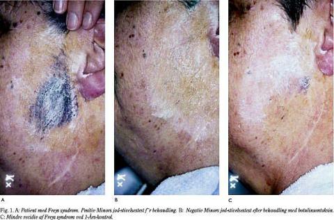 Materiale og metoder: Senresultaterne efter parotiskirurgi blev i 1999 undersøgt ved efterkontrol af de patienter, der i årene 1993-1998 var opereret for parotistumorer på øre-næse-halsafdelingen i Viborg. Fire patienter med generende FS blev behandlet for dette. Som objektivt mål for FS udførte vi Minors jod-stivelsestest. Ved denne test viser det afficerede hudområde sig tydeligt. Efter forudgående anlæggelse af lokalanæstesi kan injektionerne gives. Vi anvendte botulinumtoksin type A (Botox). 100 E opløstes i 4 ml 0,9% NaCl, svarende til en koncentration på 2,5 E/0,1 ml. Der injiceredes 0,5 E/cm 2 . Afstanden mellem injektionsstederne var 1 cm.