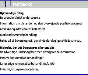 Risikofaktorer kan ofte identificeres tidligt i forløbet og bør afklares med relevante interventioner. Har patienten vedvarende symptomer, og vælges det at supplere med konservative behandlinger, bør disse være aktive og fokusere på at opretholde eller genvinde det vanlige aktivitetsniveau.