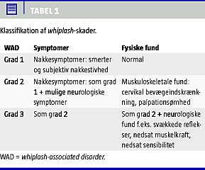 Patienter med følgesymptomer efter whiplash er en heterogen gruppe hvad angår symptomernes art, omfang og objektive fund. Whiplash-associated disorders (WAD) er den mest kendte betegnelse for whiplash-relaterede gener. Følgesymptomerne opdeles i de fleste nyere prospektive studier i tre grader [1] (Tabel 1 ), der kan anvendes ved evalueringen både i den akutte fase og i det senere forløb. Dette bør man være opmærksom på, da symptomer og kliniske fund kan ændre sig over tid [1]. Risikofaktorer, som øger sandsynligheden for langvarige symptomer, er: smerter før uheldet, en høj initial smerteintensitet efter uheldet og tegn på en posttraumatisk stressreaktion eller psykologisk distress (depression, angst og somatiseringstræk) før uheldet [2, 3].
