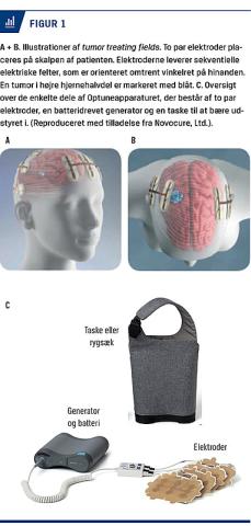 TTFields markedsføres som Optune (Novocure, Ltd.), der er CE-mærket og godkendt af US Food and Drug Administration til behandling af patienter (> 18 år) med nydiagnosticeret GBM eller recidiv-GBM. Ved nydiagnosticeret GBM anvendes TTFields efter overstået operation og konkomitantbehandling med temozolomid og stråleterapi og sammen med temozolomidvedligeholdelsesbehandling. I tilfælde af recidiv-GBM er behandlingen godkendt som monoterapi, men anvendes oftest i kombination med medicinsk onkologisk behandling. TTFields gives ved hjælp af to par elektroder, som placeres på patientens hud omkring tumorområdet (Figur 1). Elektroderne er forbundet med en batteridreven generator, som sekventielt leverer vekselspænding (200 kHz ved GBM-behandling) i to skiftende retninger. Elektrodeplaceringen optimeres hos den enkelte patient ved hjælp af særligt software (NovoTAL, Novocure, Ltd.), som sikrer et højt elektrisk felt (1-5 V/m) i tumorvævet [3-5]. Intensiteten reguleres, således at hudtemperaturen holdes under 41 °C. Udstyret har en totalvægt på 1,2 kg og bæres af patienten i en taske (Figur 1) [1]. Apparatet skal være aktivt, så længe som behandlingseffekt ønskes, og behandlingseffekten af TTFields afhænger af, hvor mange timer apparatet er aktivt i gennemsnit i løbet af et døgn [6, 7]. Maksimal effekt opnås, hvis patienten bærer det aktive apparat hele døgnet (100% komplians), mens positiv behandlingseffekt er påvist ned til 50% komplians [7]. TTFields ordineres af behandlende læger med relevant ekspertise og certificering. Behandlingen påbegyndes i samarbejde med leverandøren, som oplærer patienten og pårørende i brug af apparatet, herunder montering af elektroder, som skal skiftes hver 3.-4. dag [1]. Kliniske aspekter af behandlingen håndteres af de behandlingsansvarlige læger, imens tekniske aspekter håndteres af leverandøren. Behandlingen pågår sædvanligvis, indtil sygdomsprogression og i nogle tilfælde efter.
