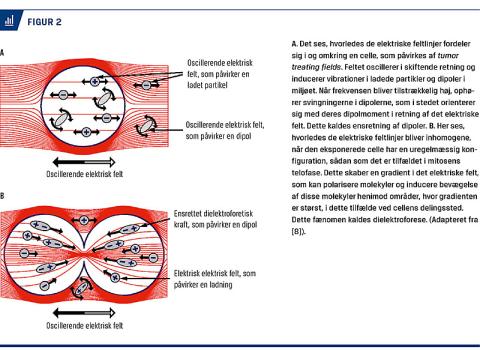 Teknologien virker overvejende gennem to fysiske mekanismer: 1) dielektroforese og 2) ensretning af dipoler [3, 8, 9]. Dielektroforese beskriver processen, hvorved det elektriske felt inducerer migration af polariserede molekyler eller organeller. Disse strukturer akkumuleres derved i de områder af det intracellulære eller ekstracellulære miljø, hvor gradienten af det elektriske felt er størst (Figur 2). Effekten er særligt udtalt på delende celler i telofase, hvis timeglasform medfører et stærkt uregelmæssigt elektrisk felt i cellen, således at molekyler og organeller samles ufysiologisk omkring cellens delingssted [3, 8, 9]. Den anden mekanisme (ensretning af dipoler) beror på, at polariserede strukturer orienterer sig i retning af det elektriske felt og derved ikke kan interagere normalt med omkringliggende strukturer. TTFields forstyrrer således en række biologiske mekanismer, som er væsentlige for celledelingen. Som eksempler kan nævnes polymeriseringen af tubulindimerer til mikrotubuli [10] og opbygningen af septinskeletstrukturer [11] omkring cellens delingssted, der begge er afgørende for succesfuld celledeling [12]. Ultimativt medfører TTFields en forlænget gennemsnitlig delingstid af kræftcellerne og øget forekomst af programmeret celledød [9].