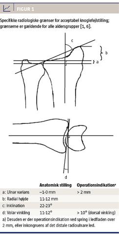 primært baseret på de radiologiske forhold, hvor anatomien genoprettes under hensyntagen til funktionsniveau [3]. I de nyligt udarbejdede danske nationale kliniske retningslinjer for DRF er der for acceptabel knoglefejlstilling opstillet specifikke radiologiske grænser, der er gældende for alle aldersgrupper
