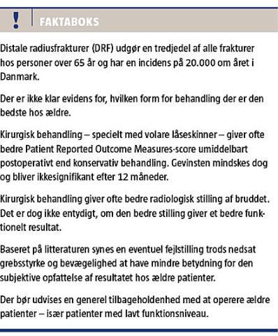 behandling hos ældre patienter med lavt funktions-niveau. Formentlig kan mange frakturer hos ældre behandles konservativt. Udfordringen består i at bestemme, hvilke patienter der har gavn af kirurgisk behandling, og hvilke der ikke har, samt at udfærdige klinisk brugbare kriterier for et funktionsniveau, hvor man bør udvise tilbageholdenhed med kirurgisk behandling. I fremtidige studier bør man fokusere på at klarlægge, om radiologiske operationskriterier – og i givet fald hvilke – for ældre over 65 år er prognostiske for resultatet. I de nationale kliniske retningslinjer anbefales operation med volare låseskinner, hvis fejlstillingen overstiger de nævnte grænser. Anbefalingen er givet prædikatet »god praksis«, der er den laveste styrke til en anbefaling, ud fra erkendelsen af, at evidensen er sparsom. Vi finder dog ikke, at anbefalingen er hensigtsmæssig, da vi mener, at den vil resultere i en overbehandling hos gruppen af ældre
