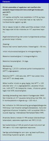 Summary Argatroban treatment of heparin-induced immune-mediated thrombocytopenia Ugeskr Læger 2009;171(8):610-611 Heparin-induced immune-mediated thrombocytopenia (HIT) is a life-threatening complication of heparin treatment. When HIT is clinically suspected, heparin treatment should immediately be replaced with an alternative, fast-acting, anticoagulant agent, and blood tests should be carried out to verify or to exclude the diagnosis. Argatroban has recently been approved for HIT treatment in Denmark. Recommendations for dosing of argatroban in HIT patients with and without comorbities are presented.