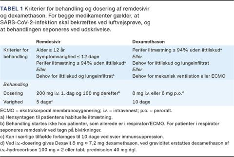 Der tilbydes behandling med remdesivir og dexamethason til patienter med hypoksisk COVID-19 (Tabel 1). Der er ingen eller skadelig effekt af lopinavir/ritonavir, interferon 1-beta, hydroxychloroquin, og azithromycin [15]. For nuværende bør anden medikamentel behandling end remdesivir, steroid og tromboseprofylakse kun gives i protokolleret regi.