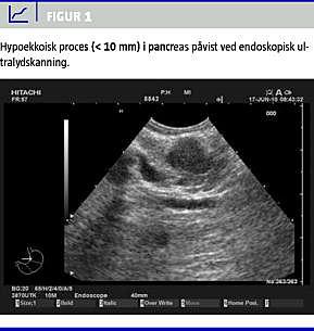 Patienten blev henvist til en kirurgisk afdeling med henblik på endoskopisk ultralydskanning (EUS). Denne undersøgelse viste to forandringer på overgangen mellem corpus og cauda pancreatis. I den ene, en 8 mm, let spikuleret og hypoekkoisk forandring, blev der forsøgt finnålsaspiration med henblik på diagnose. I forbindelse med dette fremkom et hæmatom, hvori processen forsvandt. 1,5 cm perifert herfor sås en 6 mm stor, mere hypoekkoisk og fuldstændig velafgrænset proces. På grund af patientens komorbiditet fandtes han ikke egnet til hverken åben eller laparoskopisk kirurgi. Man valgte i stedet at forsøge behandling med alkoholsklerosering, og idet der fremkom et hæmatom i den største af de to processer, valgte man udelukkende at injicere alkohol i den mindste. Der blev i alt injiceret 3,5 ml absolut alkohol (98%) i den mindste tumor (Figur 1 ).