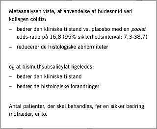 Et nyligt publiceret Cochrane-review bygger på de fire offentliggjorte, randomiserede, dobbelt-blinde og placebokontrollerede forsøg, der alle blev udført i slutningen af 1990'erne [6]. I tre af undersøgelserne anvendte man budesonid (givet til henholdsvis 20, 23 og 43 patienter) [7-9] og i en undersøgelse anvendte man bismuthsubsalicylat (givet til ni patienter) i 6-8 uger) [10]. Der er ikke fundet systematiske fejl i disse arbejder (f.eks. skjult allokering, blindingsproblemer eller andre kvalitetsmæssige problemer). Bismuthsubsalicylat, der er et i Danmark ikke markedsført præparatet, har antibakterielle samt antiinflammatoriske egenskaber og nedsætter peristaltikken. Formålet var at afdække de to præparaters behandlingseffektivitet hos patienter med aktiv og biopsiverificeret kollagen colitis. Det primære behandlingsmål var klinisk bedring defineret ved nedsat afføringsfrekvens og/eller fæcesvægt, mens det sekundære behandlingsmål var histologisk bedring.