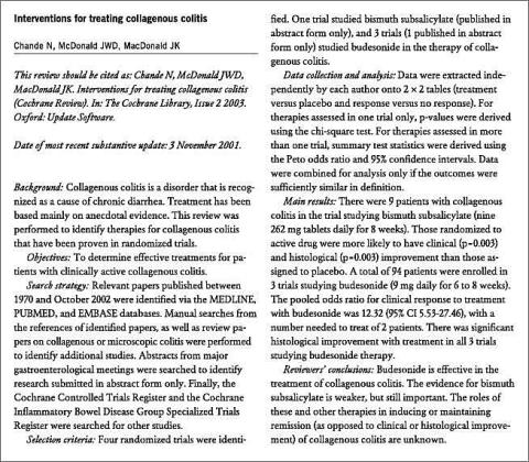 <li>Chande N, McDonald JWD, MacDonald JK. Interventions for treating collagenous colitis (Cochrane Review). I: The Cochrane Library 2002, 4. Oxford: Update Software.</li>
