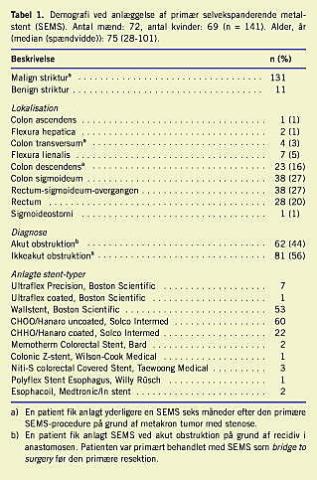 Materiale og metoder: Der blev inkluderet 162 konsekutive SEMS-procedurer hos 141 patienter (72 mænd (51%)) i perioden maj 1997-september 2004. Medianalderen var 75 år (spændvidde 28-101 år). Hos 11 patienter var strikturen benign. Blandt patienter med malign striktur blev 62 (44%) primære procedurer foretaget ved akut obstruktion.
