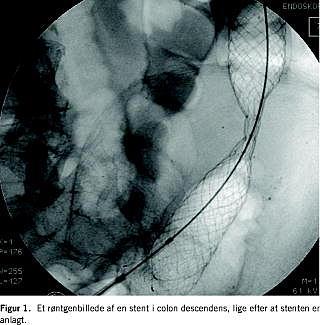 Resultater: Sytten patienter havde behov for mere end en SEMS-procedure. Frekvensen af stentperforation af tarmen var 2%, og frekvensen af migration af stent var 10%. Vores 30-dages-mortalitet efter stentanlæggelse og eventuel senere operation ved akut colonobstruktion var på 17%, og der kunne foretages resektion med primær anastomose uden stomi hos 76%. Femten patienter fik SEMS som definitiv behandling af den akutte colonobstruktion, og de blev sparet for en laparotomi. Blandt patienterne i den palliative gruppe var der kun behov for senere anlæggelse af stomi hos 10%. Elleve patienter med benigne strikturer fik anlagt SEMS. Hos syv patienter var dette ikke en succes.