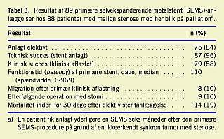 I alt 89 patienter fik foretaget 101 SEMS-procedurer som palliation for en malign stenose. Resultaterne af den primære SEMS-procedure fremgår af Tabel 3 . Ni patienter havde trods anlæggelse af initialt velfungerende SEMS senere behov for anlæggelse af stomi. To patienter fik trods klinisk aflastning nekrose af colon oralt for obstruktionen som udtryk for, at patienten var aflastet for sent. I to tilfælde migrerede stenten, en stent blev aflukket af tarmvæggen, mens tre stent blev okkluderet af tumor. I et tilfælde havde patienten smerter og imperiøs diare, hvorfor stenten blev fjernet og en stomi anlagt.