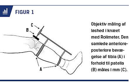 Objektivt finder man løshed ved Lachmans test og/eller skuffetest (Figur 1). Løsheden bør altid kvantificeres med en laksitetsmåler, f.eks. et Rolimeter (Figur 1). Klinisk undersøgelse af en totalruptur er lige så sensitiv og specifik som en MR-skan-ning [3] (Figur 2).