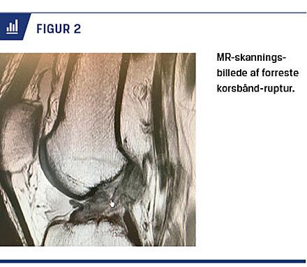 Ved en MR-skanning kan man påvise strukturelle forandringer ved korsbåndsskade og vise associerede skader (Figur 2). Man finder typisk bone bruise i den laterale femurkondyl og den laterale tibiakondyl. Bone bruise er en kompressionsskade af brusk og den underliggende knogle og er opstået ved kollision imellem de to knogler ved traumet. I mange tilfælde fremtræder ACL normalt ved en MR-skanning trods en komplet overrivning [2, 3].