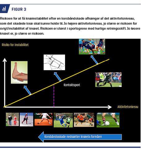 Behovet for yderligere behandling efter en korsbåndsskade afhænger af risikoen for udvikling af senere knæinstabilitet (Figur 3). De fleste personer med et højt aktivitetsniveau, der involverer hurtige stop og drej, som i håndbold og fodbold, kan ikke komme tilbage til samme niveau med et løst knæ. Hvis man reducerer den knæbelastende aktivitet, kan man dog nedsætte risikoen for knæsvigt [2, 5].