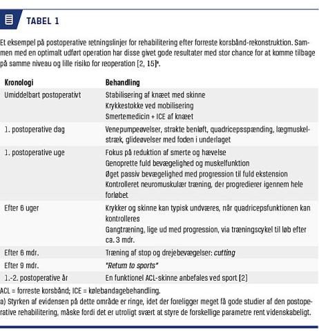 Evidensen for et bestemt rehabiliteringsprogram er desværre ringe. Der kan ikke påvises forskel i klinisk outcome mellem accelereret og ikkeaccelereret rehabilitering [2, 22]. En eventuel betydning af timing og intensitet af rehabiliteringen er uafklaret [2, 15].