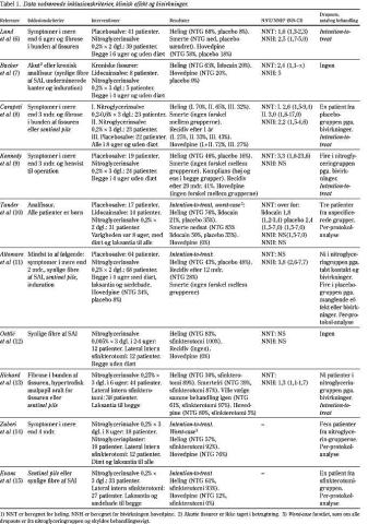 Man har derfor ledt efter andre, mindre invasive behandlingsformer, og lokalbehandling med nitroglycerinsalve er blevet foreslået (4). Rationalet bag denne behandling er, at nitrogenoxid dels nedsætter hviletonus i SAI, dels virker vasodilaterende og dermed formodes at forbedre ilttilførslen til området. Der er ikke tidligere foretaget en systematisk vurdering af emnet, hvilket er baggrunden for dette litteraturstudie.