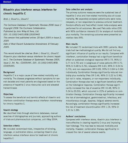 I alt 72 arbejder - abstrakter og publicerede artikler - med ca. 10.000 patienter blev inkluderet i analysen efter søgning i The Cochrane Hepato-Biliary Group Trials Register, The Cochrane Central Register of Controlled Trials (Central). MEDLINE og Embase. Kun randomiserede behandlingsstudier, hvor interferonmonoterapi blev sammenlignet med kombinationen interferon og ribavirin, indgik i review 'et. Blinding var ikke et krav. Såvel Pegyleret interferon som forskellige undertyper af interferon-alfa blev anvendt, ligesom der i 13 studier blev brugt forskellig interferondosis i de to arme. Ribavirindøgndosis varierede mellem 1.000 og 1.200 mg (52 studier), 800 og 1.000 mg (11 studier), 14-15 mg pr. kg (seks studier), 600 mg (to studier) og i et studie var dosis ikke angivet. Behandlingsvarigheden varierede mellem seks og 78 uger. I 16 af de vurderede arbejder var der kun oplysninger om respons ved afslutning af behandlingen, mens der i de resterende var en vurdering af behandlingseffekten 4 til 96 uger efter behandlingsophør.