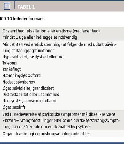 De diagnostiske ICD-10-kriterier for mani ses af Tabel 1 [5]. Nedsat behov for søvn er et hyppigt symptom, ofte det tidligste. Manglende søvn kan i sig selv forværre manien og medvirke til udvikling af akut delirium, der viser sig ved svær bevidsthedsplumring og hyperaktivitet, hvilket ubehandlet kan medføre hypertermi, kredsløbsmæssig kollaps og død. Mani er ledsaget af vrangforestillinger og hallucinationer i henholdsvis ca. 50% og 25% af tilfældene [6], og oftest er der nedsat (eventuelt ingen) sygdomserkendelse. Mani adskiller sig fra hypomani ved symptomernes sværhedsgrad og varighed (fire dage ved hypomani). Hypomani er ikke i sig selv akut behandlingskrævende [7], men kan være led i en udvikling mod mani og må som sådan kalde på behandling.