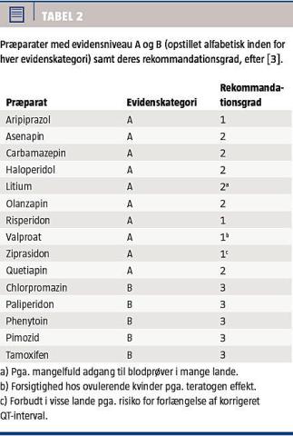 Peroral dosering og RG tilpasset danske forhold fremgår af Tabel 3 [21]. Vi har her opgraderet litium til RG 1, da vi i Danmark har stor erfaring med litium, som dog ikke bør anvendes hos de mest agiterede patienter, da optitrering under serummonitorering kan forsinke effekten. Vi har ligeledes opgraderet quetiapin og asenapin til RG 1 på grund af resultaterne af nyere studier samt givet zuclopenthixol RG 2 trods evidensniveau C, pga. den udbredte anvendelse i Danmark og antagelsen om antimanisk klasseeffekt for alle typiske antipsykotika. Vi tildelte clozapin RG 3 trods evidensniveau C for at tilskynde til anvendelsen i behandlingsrefraktære tilfælde [24]. Vi nedgraderede carbamazepin på grund af interaktionsrisiko.