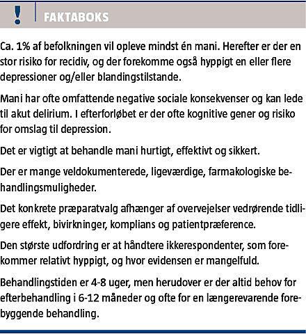 Det er vigtigt at behandle mani hurtigt, effektivt og sikkert. Selvom den evidens, der ligger bag de gennemgåede behandlingsvejledninger, har åbenlyse begrænsninger, er disse det bedste udgangspunkt, vi har i tilrettelæggelsen af behandlingen, og selvom vi ofte kommer i situationer, hvor evidensen ikke rækker fuldt, må vi i det mindste tilstræbe en systematisk og rationel praksis.
