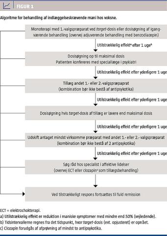 I retningslinjerne fra WFSBP blev der opstillet en behandlingsalgoritme, og da der ikke fandtes væsentlig effektmæssig forskel mellem de antimaniske lægemidler, blev det anbefalet at begynde monoterapi med et RG 1-præparat. Det blev således ikke tilrådet at begynde med en kombination af lægemidler, trods en enkelt undersøgelse, hvis resultater understøttede dette [19]. En sideløbende medicinering med benzodiazepiner opfattedes ikke som led i kombinationsbehandling, idet man i alle RKU tillader en sådan strategi i de første 7-14 dage. Ligeledes opfattedes en fortsat forebyggende behandling efter et manisk gennembrud ikke som en del af en kombinationsbehandling, medmindre der fandt en dosisøgning sted. Hvis der ikke blev opnået tilstrækkelig effekt efter to uger, blev det anbefalet at justere dosis eller skifte præparat. Der foreligger imidlertid ingen evidens for denne strategi. Da to uger forekommer at være længe at vente, og kombinationsbehandling frem for præparatskifte er mere rationelt og evidensbaseret [20], modificerede vi algoritmen, som det fremgår af Figur 1 [21]. Det skal understreges, at ECT kan og bør overvejes på ethvert trin i algoritmen ved svær mani, især hvis der er begyndende delirium.