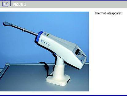 På Slagelse Sygehus har vi siden januar 2006 brugt Thermablate (Figur 1 ), og vi har udført over 150 behandlinger. Vi valgte denne form for behandling, fordi indgrebet kunne udføres ambulant, var let at udføre og havde få komplikationer. Thermablate har en høj arbejdstemperatur (178 °C), hvilket reducerer behandlingstiden til to minutter [3], mens -andre termoballonbehandlingsregimer kræver 8-15 minutters behandling [4-6]. Den højere temperaturgradient forventes at give mindre temperatureffekt dybere end i endometriet, og derfor mindre ubehag for patienterne efter behandlingen. Behandlingstiltaget gjorde det muligt at udnytte vores sparsomme operationskapacitet til andre patientkategorier.