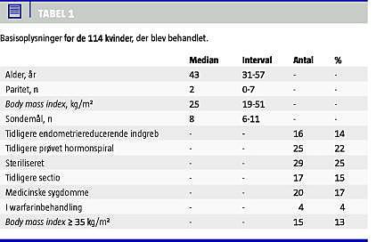 Resultater: Der var få problemer forbundet med indgrebet. Den generelle tilfredshed hos patienterne var god, idet 76% var tilfredse eller meget tilfredse. Hos over 80% reduceredes blødningsmængden, men kun 7% blev amenoroiske.