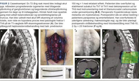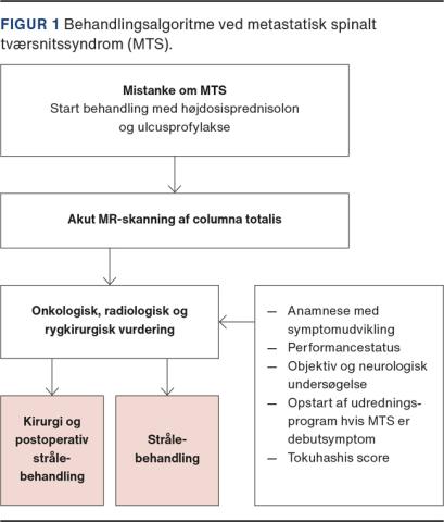 Metastatisk spinalt tværsnitssyndrom (MTS) er en akut onkologisk tilstand, der er defineret ved symptomatisk kompression af medulla spinalis eller cauda equina fra en metastaserende tumor. MTS er en bred betegnelse, som omfatter en række tilstande med varierende grad af kompression, hvilket medfører store variationer i symptomatologien. MTS skyldes hyppigst knoglemetastaser i columna med indvækst i spinalkanalen. Autopsistudier viser, at over to tredjedele af de patienter, der er døde med metastatisk kræftsygdom, har metastaser i columna [1]. I 2010 var etårsoverlevelsen fra MTS-diagnosetidspunktet for en kohorte af danske patienter på 29,2% [2]. MTS kan udvikle sig til en permanent invaliderende tilstand, hvorfor hurtig start af behandling er afgørende for chancen for at bevare eller genoprette påvirkede neurologiske funktioner. Behandlingen af MTS er primært palliativ og sigter mod at bevare eller forbedre livskvaliteten [3, 4].